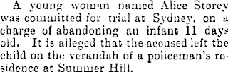 A young woman named Alice Storey was committed for trial at Sydney, on a charge of abandoning an infant If days old, It is alleged that the accused left the child on the verandah of a policeman’s residence at Summer Hill.
