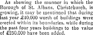 As shewing the manner in which the Borough of St. Albans, Christchurch, is growing, it may be mentioned that during last year £40,000 worth of buildings were erected within its boundaries, while during the past four years buildings to the value of £250,000 have been added.