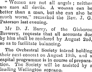 " Women are not all angels ; neither are men all devils. A woman can be better than a man, but she can also ho much worse,” remarked tho Rev. J. G. Paterson last evening. Mr D. J. Barry, of the Gisborne Brewery, requests that all accounts due by him shall be rendered by August 2nd, so as to facilitate balancing. Tho Orchestral Society intend holding their next concert on August 10th, and a capital programme is in course of preparation. The Society will he assisted by a leading Wellington soprano.