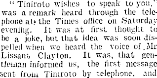“ Tiniroto wishes to speak to you,” was a remark heard through the telephone at? the Times office on Saturday evening. It was at first thought to he a joke, hut that, idea was soon dispelled when we heard tho voice of.Mr Lissant Clayton. It was, that gentleman informed us, the first message sent from Tiniroto by telephone, and