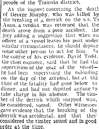 people of the Tiniroto district. At the inquest concerning the death of George Murphy, who was killed by t-iie breaking ol a derrick on the s.s. Te Anau, a verdict, was returned that Hie death arose from a pure accident, the jury adding a suggestion that when an officer of a vessel leaves his post under similar circumstances, lie should depiue .some other person to act for him., hi the course of his evidence. David Todd, the chief engineer, said that he had the supervision of the gear of the vessellie had been supervising the unloading on the day of the accident, but at the time of the fatality had gone below to dinner, and had not deputed anyone 1o tahe charge in his absence. The timber of the derrick which snapped was, he considered, sound. Other witnesses gave evidence that the breaking of the derrick was accidental, and that they considered the timber sound and in good order at .the .time. I