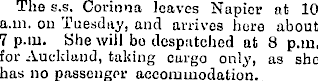 Tho s._s. Corinna leaves Napier at 10 a.m. on Tuesday, and arrives here about 7 p.in. She will bo despatched at 8 p.m. for Auckland, taking cargo only, as she has no passenger accommodation.