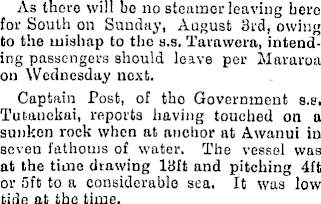 As there will bo no steamer leaving here for South on Sunday, August 3rd, owing to the mishap to the s.s. Tarawera, intending passengers should leave per Maruroa on Wednesday next. Captain Post, of tho Government s.s, Tutanekai, reports having touched on a sunken rook when at anchor at Awanui in seven fathoms of water. The vessel was at the time drawing 13ft and pitching 4ft or sft to a considerable sea. It was low tide at tho time.