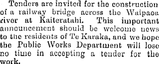 Tenders are invited for the construction of a railway bridge across tho Waipaou river at Kaiteratahi. This important announcement should be welcome news to the residents of Te Kirraka, and we hope the Public Works Department will lose no time in accepting a tender for the work.