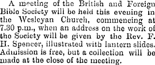 A meeting of the British and Foreign Bibio Society will be held this evening in the Wesleyan Church, commencing at 7.30 p.m., when an address on the work ol tho Society will be given by the liev. F. H. Spencer, illustrated with lantern slides. Admission is free, but a collection will be ruado at the closo of tho meeting.