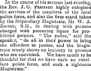 In the course of his sermon last evening, the Rev. J. G. Paterson highly eulogised the services of the members of tho local police foreo, and also the firm stand taken by the Stipendiary Magistrate, Mr W. A. Barton, S.M., in dealing with persons charged with procuring liquor for prohibited persons. “ The police,” said tho speaker, “'do all in their power to bring tho offenders to justice, and tho Magistrate wisely shows no leniency to persons who are convicted. We have much to be thankful for that wo have such an excellent police forco, and such a righteous Magistrate.”