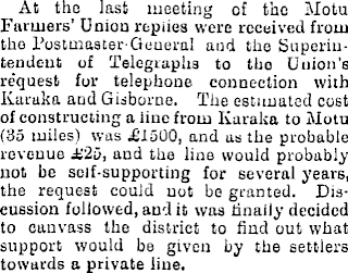 At the last meeting of the Motu Farmers’ Union replies were received from tho Postmaster-General and the Superintendent of Telegraphs to the Union’s re'quest fur telephone, connection with Karuka and Gisborne. The estimated cost of constructing a line from Karaka to Motu (35 miles) was £ISOO, and us the probable revenue £25, and the line would probably not be self-supporting for several years, the request could not be granted. Discussion followed, and it was finally decided to canvass the district to find out what support would be given by the settlers towards a private line.