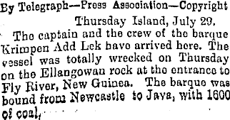By Telegraph—Press Association—Copyright Thursday Island, July 29. Tho captain and tho crew of the barque Krimpon Add Lck havo arrived here. The vessel was totally wrecked on Thursday on tho Ellangowan rock at tho entrance to Flv River, New Guinea. The barque was bound from Newcastle to Java, with 1600 oi coal,