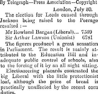 By Telegraph—Pres3 Association—Copyright London, July 80. The olcclion for Leeds caused through Jackson being raised to the I’eerago resulted : Mr Rowland Bargan (Liberal)... 7539 Sir Arthur Lawson (Unionist) 0781 The figures produced a great sensation in Parliament. Tbo result is mainly attributed to the Education Bill and inadequate public control of schools, also to tiie forcing of it by an all night sitting. Electioneering placards contrasted the big Liberal with tho little protectionist loaf, although the price of bread is practically unaffected by the recent corn duties,