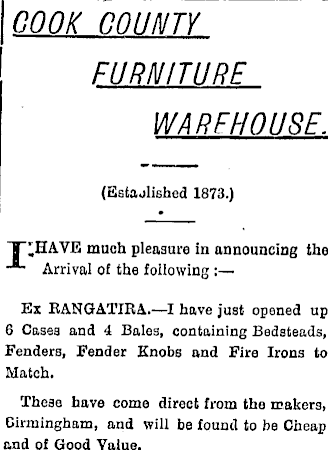 COOK COUNTY FURNITURE WAREHOUSE. (Estajlished 1873.) T'HAVE much pleasure in announcing the -*■ Arrival of the following : Ex ItANGATIKA.—I have just opened up 6 Cases and 4 Bales, containing Bedsteads, Fenders, Fender Knobs and Fire Irons to Match. Theae have come direct from the makers, Birmingham, and will be found to be Cheap and of Good Value.