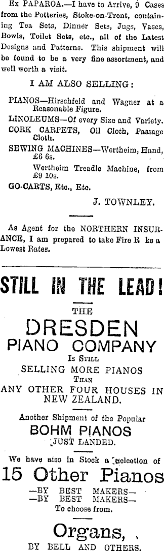Ex PAPAROA.—I have to Arrive, 9 Cases from the Potteries, Stoke-on-Trent, containing Tea Sets, Dinner Sets, Jugs, Vases, Bowls, Toilet Sets, etc., all of the Latest Designs and Patterns. This shipment will be found to be a very fine assortment, and well worth a visit. I AM ALSO SELLING: PIANOS-—Hirschfeld and Wagner at a Reasonable Figure. LINOLEUMS—Of every Size and Variety. CORK CARPETS, Oil Cloth, Passage Cloth. SEWING MACHlNES—Wertheim, Hand, £6 6s. Wertheim Treadle Machine, from £9 10s. GO-CARTS, Etc., Eto. J. TOWNLEY. As Agent for the NORTHERN INSURANCE, I am prepared to take Fire R ks a Lowest Rates. STILL IN JHE LEAD I THE DRESDEN PIANO COMPANY Is Still SELLING MORE PIANOS Than ANY OTHER FOUR HOUSES IN NEW ZEALAND. Another Shipment of the Popular BOHM PIANOS k JOST LANDED. We have also In Stock a 'ueleotion of 15 Other Pianos —BY BEST MAKERS——BY BEST MAKERS— To choose from. Organs, , BY BELL AND OTHERS.