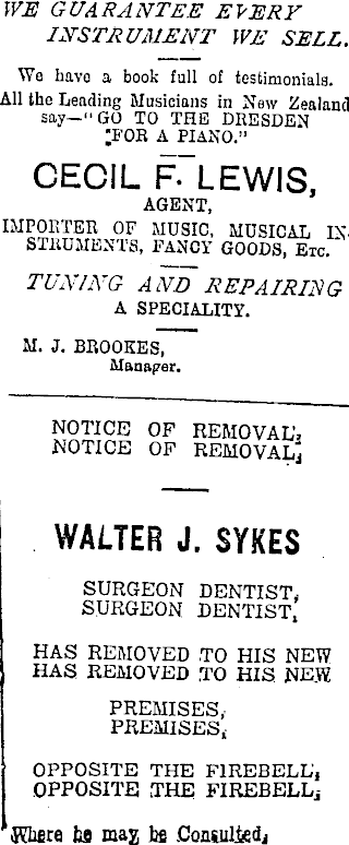 WE guarantee every INSTRUMENT WE SELL. We havo a book full of testimonials. All the Leading Musicians in New Zealand say—“GO TO THE DRESDEN ;for a piano.” CECIL F- LEWIS, AGENT, IMPORTER OF MUSIC, MUSICAL INSTRUMENTS, FANCY GOODS, Etc. TUNING AND REPAIRING A SPECIALITY. M. J. BROOKES, Manager. NOTICE OF REMOVAL', NOTICE OF REMOVAL* WALTER J. SYKES SURGEON DENTIST SURGEON DENTIST,’ HAS REMOVED TO HIS NEW HAS REMOVED TO HIS NEW PREMISES,PREMISES, OPPOSITE THE FIREBELL', OPPOSITE .THE FIREBELL* Klifire hfl max be Consulted*