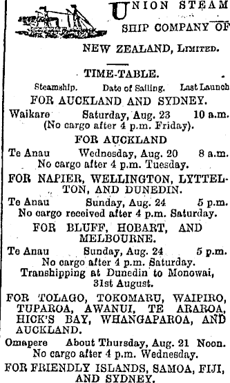 TJ JNION STEAM SHIP COMPANY'OF NEW ZEALAND, Limited. TIME-TABLE. Steamship. Date of Sailing. Last Launch FOR AUCKLAND AND SYDNEY. Waikare Saturday, Aug. 23 10 a.m. (No cargo after 4 p.m. Friday). FOR AUCKLAND Te Anau Wednesday, Aug. 20 8 a.m. No cargo after 4 p.m. Tuesday. FOR NAPIER, WELLINGTON, LYTTELTON, AND DUNEDIN. Te Anau Sunday, Aug. 24 5 p.m. No cargo received after 4 p.m. Saturday. FOR BLUFF, HOBART, AND MELBOURNE. To Anau Sunday, Aug. 24 5 p.m. No oargo after 4 p.m. Saturday. Transhipping at Dunedin to Monowai, 31st August. FOR TOLAGO, TOKOMARU, WAIPIRO, TUPAROA, AWANUI, TE ARAROA, HICK'S BAY, WHANGAPAROA, AND AUCKLAND. Omnpere About Thursday, Aug. 21 Noon. No cargo after 4 p.m. Wednesday. FOR FRIENDLY ISLANDS, SAMOA, FIJI, AND SYDNEY.