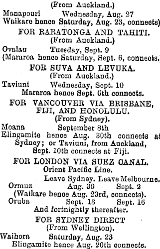 (From Auckland.) Manapouri Wednesday, Aug. 27 Waikaro hence Saturday, Aug. 23, conneotß). FOR RARATONGA AND TAHITI. (From Auckland.) Ovalau Tuesday, Sept. 9 (Mararoa hence Saturday, Sept. 6, conneots.) FOR SUVA AND LEVUKA. (From Auckland.) Taviuni Wednesday, Sept. 10 Mararoa henoe Sept. Gth conneots. FOR VANCOUVER VIA BRISBANE, FIJI, AND HONOLULU. (From Sydney). Moana _ September Bth Elingamite hence Aug. 30th oonnects at Sydney; or Taviuni, from Auckland, Sept. 10th oonnects at Fiji. FOR LONDON VIA SUEZ CANAL. Orient Paoifio Line. Leave Sydney. Leave Melbourne. Ormuz Aug. 30 Sept. 2 (Waikare henoe Aug. 23rd, conneots). Oruba Sept. 13 Sept. 10 And fortnightly thereafter. FOR SYDNEY DIRECT (From Wellington). Waihora Saturday, Aug. 23 Elingamite hence Aug. 20th connects.
