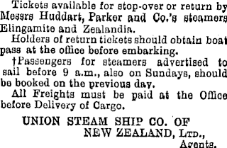 Tickets available for stop-over or return by Messrs Huddart, Parker and Co.’s steamers Elingamito and Zealandia. Holders of return tickets should obtain boat pass at the office before embarking. ■[Passengers for steamers advertised to sail before 9 a.m., also on Sundays, should be booked on the previous day. All Freights must be paid at the Offioe before Delivery of Cargo. UNION STEAM SHIP CO. OP NEW ZEALAND, Ltd., Avonts.