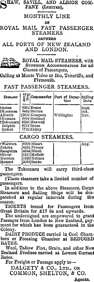 s : HAW, SAVILL, AND ALBION COMPANY (Limited), MONTHLY LINE OF ROYAL MAIL FAST PASSENGER STEAMERS BETWEEN ALL PORTS OF NEW ZEALAND AND LONDON. figi. ROYAL MAIL STEAMERS, with Superior Accommodation for all Classes of Passengers, Calling at Monte Video or Rio, Tenerille, and Plymouth. FAST PASSENGER STEAMERS. The Tokomaru will oarry third-olass passengers. tThese steamers take a limited number of passengers. In addition to the above Steamers, Cargo Steamers and Sailing Ships will be despatched at regular intervals during the season. TICKETS issued for Passengers from Great Britain for £l7 6s and upwards. The undorsigned are empowered to grant Passages from London to New Zealand, payment for which has been guaranteed in the Colony. DAIRY PRODUCE oarried in Cool Chambers or' Freezing Chamber at REDUCED RATES. Wool, Tallow Flax, Grain, and other New Zealand Produae oarried at Lowest Current Rates. For Freight or Passage apply to— DALGETY & CO., Ltd., OR COMMON, SHELTON, & CO. Agents.