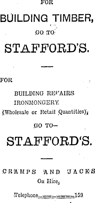 FOR BUILDING TIMBER, .GO TO STAFFORD’S. FOR BUILDING REPAIRS IRONMONGERY, .(Wholesale or Retail .Quantities)! GO TOSTAFFORD'S. CR'A MP S 'AND 'JACKS On Hire. Telephone...--^