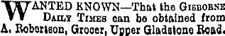 WANTED KNOWN—That the Gisborne Daily Times can be obtained from A. Robertson, Grooer, Upper Gladstone Road.
