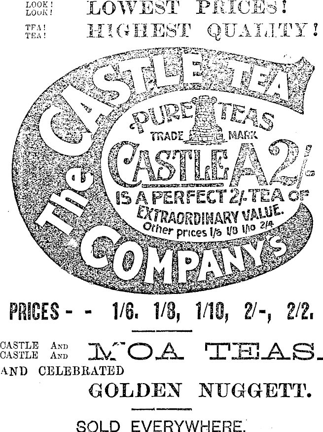 LOOK ! LOOK ! TF A ! TEA ! LOWEST PRICES! HIGHEST QUALITY ! >M Jit* 'Smn4w * TIttDEjg|gLMARK. eA2s >•••• PERFECT 2/-TEA ®n?AORDiNARY^V!r & SB? 2/4 pther m prices PRICES • - 1/8. 1/10. 21-, 2/2. CASTLE IS K'OA TEAS. and celebrated GOLDEN NTTGGETT. SOLD EVERYWHERE.