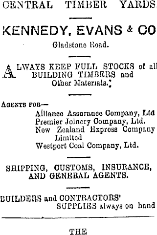 CENTRAL TIMBER YARDS. KENNEDY. EVANS & CO Gladstono Road. t LWAYS KEEP FULL STOCKS ol all 3 L BUILDING TIMBERS and Other Materials.^ Agents ron— Ailianoe Assurance Company, Ltd Premier Joinery Company, Ltd. New Zealand Express Company Limited Westport Coal Company, Ltd. SHIPPING, CUSTOMS, INSURANCE, AND GENERAL AGENTS. BUILDERS and CONTRACTORS' SUPPLIES always on hand THE