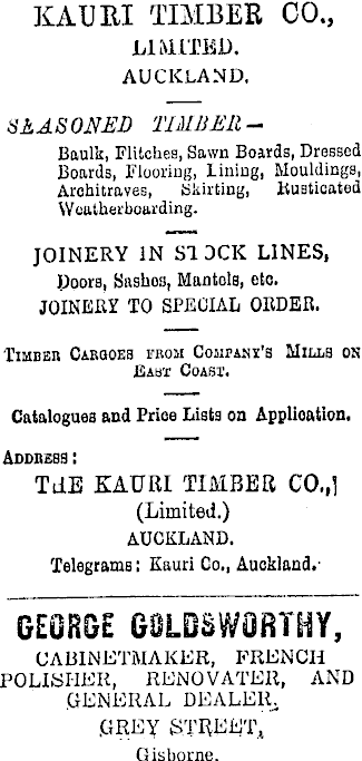 KAURI TIMBER CO., limited. AUCKLAND. SEASONED TIMBERBaulk, Flitches, Sawn Boards, Dressed Boards, Flooring, lining, Mouldings, Architraves, Skirting, ltusticated Weatherboarding. JOINERY IN STOCK LINES, Doors, Sashos, Mantels, eto. JOINERY TO SPECIAL ORDER. Timber Carqoes from Company's Minus on East Coasx. Catalogues and Prioe Lists on Application. Address : TdE KAURI TIMBER CO.,] (Limited.) AUCKLAND. Telegrams: Kauri Co., Auckland.GEORGE GOLDSWORTHY, CABINETMAKER, FRENCH POLISHER, RENOVATER, AND GENERAL DEALER. grey street, Gisborne.