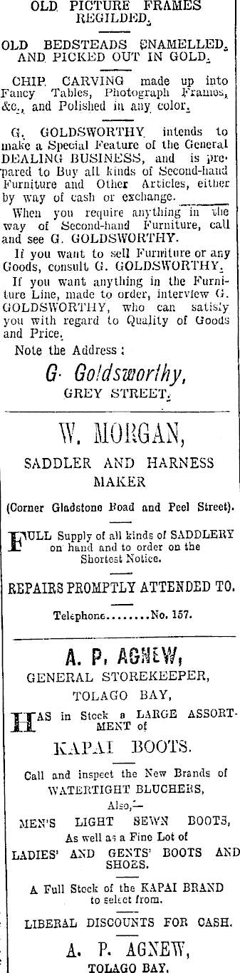 OLD PICTURE FRAMES REGILDED. OLD BEDSTEADS ENAMELLED. AND PICKED OUT IN GOLD. CHIP. CARVING made up into Fancy Tables, Photograph Frames, &c., and Polished in any color. G, GOLDSWORTHY intends to malic a Special Feature of the General DEALING BUSINESS, and is prepared to Buy aIL kinds ol Second-hand Furniture and Other Articles, either hy way of cash or exchange. When you require anything in the way of Second-hand Furniture, call and see G. GOLDSWORTHY. If you want to sell Furniture or any Goods, consult G. GOLDSWORTHY. If you want anything in the Furniture Line, made to order, interview G. GOLDSWORTHY, who can satisly you with regard to Quality of Goods and Price. Note the Address : G Go'dsworlhy, GREY STREET. W. MORGAN, SADDLER AND HARNESS MAKER (Corner Gladstone Road and Peel Street). FULL Supply oi all kinds of SADDLERY on hand and to order on the Shortest Notice. REPAIRS PROMPTLY ATTENDED TO, Telephone No. 157. A. P, AGMEV/, GENERAL STOREKEEPER, TOLAG'O BAY, HAS in Stock s LARGE ASSORTMENT of KAPAI BOOTS. Call and inspect the New Brands of WATERTIGHT BLUCHERS, Also,— MEN’S LIGHT SEWN BOOT 3, As well as a Fine Lot of LADIES’ AND GENTS’ BOOTS AND SHOES. A Full Stock of the KAPAI BRAND to select from. LIBERAL DISCOUNTS FOR CASH. A. p.Tgxew, TOLAGQ BAY,