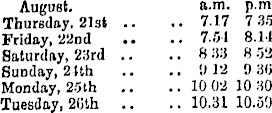August. a.m. p.m. Thursday. 21st .. .. 7.17 7 35 Friday, 22nd .. .. 7.51 8.11 Saturday, 23rd .. .. 8 33 8 52 Sunday, 2 tth .. 0 12 !) 30 Monday, 25th .. 10 02 10 30 Tuesday, 20th .. 10.31 10.5!)