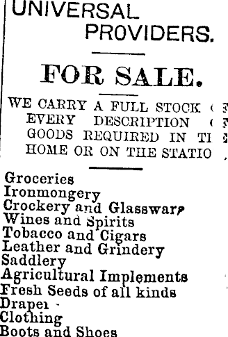 UNIVERSAL PROVIDERS. FOR SALE. WE CARRY A FULL STOCK < EVERY DESCRIPTION t GOODS REQUIRED IN TI HOME OR ON THE STATIO Groceries Ironmongery Crockery and Glassware Wines and Spirits Tobacco and Cigars Leather and Grindery Saddlery Agricultural Implements Fresh Seeds of all kinds Drapei - Clothing Boots and Shoes