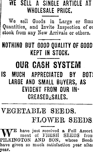 WE SELL A SINGLE ARTICLE AT WHOLESALE PRICE. We sail Goods in Large or Sma Quantities, and Invite Inspection of oi slook from any New Arrivals or others. NOTHING BUT GOOD QUALITY OF GOOD KEPT IN STOCK. OUR CASH SYSTEM IS MUCH APPRECIATED BY BOT; LARGE AND SMALL BUYERS, AS EVIDENT FROM OUR lIICREASEDiSALES. VEGETABLE SEEDS. FLOWER SEEDS WE have just reoeived a Full Assort ment of FBESH SEEDS torn PILKINGTON AND SON, whose Seodt have given so much satisfaction year aftei year.