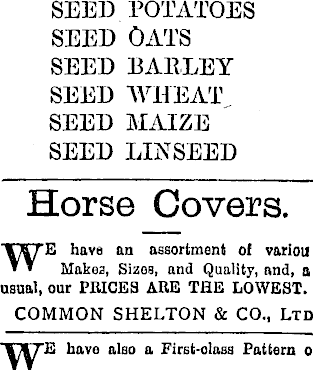SEED POTATOES SEED OATS SEED BAIILEY SEED WHEAT SEED MAIZE SEED LINSEED Horse Covers. WE have an assortment of variou Makes, Sizes, and Quality, and, a usual, our PRICES ARE THE LOWEST. COMMON SHELTON & CO., Ltd "E have also a First-olass Pattern o: