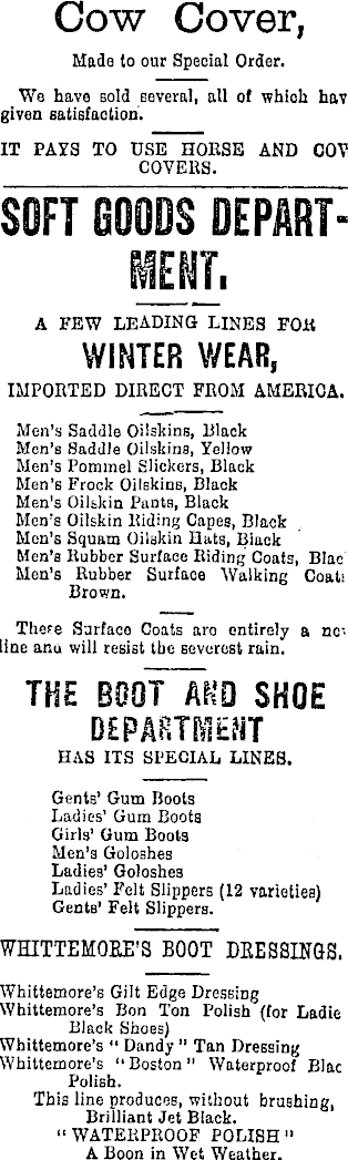 Cow Cover, Made to our Special Order. We have sold several, all of whioh hav given satisfaction. IT PAYS TO USE HORSE AND COV; COVERS. SOFT GOODS DEPARTMENT. A FEW LEADING LINES FOR WINTER WEAR, IMPORTED DIRECT FROM AMERICA. Men’s Saddle Oilskinß, Black Men’s Saddle Oilskins, Yellow Men’s Pommel Slickers, Black Men’s Frock Oilskins, Black Men’s Oilskin Pants, Black Men’s Oilskin Riding Capes, Black Men’s Squam Oilskin Hats, Black Men’s Rubber Surface Biding Coats, Blac Men’s Rubber Surface Walking Coat; Brown. There Surfaco Coats arc entirely a nc line anu will resist tbo severest rain. THE BOOT m SHOE mhmrm HAS ITS SPECIAL LINES. Gents’ Gum Boots Ladies’ Gum Boots Girls’ Gum Boots Men’s Goloshes Ladies’ Goloshes Ladies’ Felt Slippers (12 varieties) Gents' Felt Slippers. WHITTEMORE'S BOOT DRESSINGS, Whittomore’s Gilt Edge Dressing Whittemore’s Bon Ton Polish (for Ladie Black Shoes) Whittemore’s “ Dandy " Tan Dressing Whittemore’s "Boston" Waterproof Blac Polish. This line produces, without brushing, Brilliant Jet Black. "WATERPROOF POLISH" A Boon in Wet Weather.