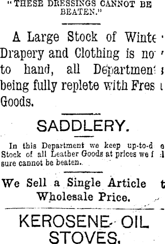 “ THESE DRESSINGS CANNOT BE BEATEN." A Large Stock of Winte • Drapery and Clothing is no - r to hand, all Department i being fully replete with Fres t Goods. SADDLERY. In this Department we keep up-to-d e Stock of all Leather Goods at prices we I .1 sure cannot be beaten. We Sell a Single Article t Wholesale Price. KEROSENE- OIL STOVES.