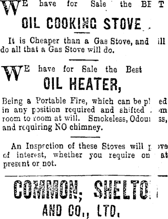 OIL COOKIHG STOVE It is Cheaper than a Gas Stove, and ill do all that a Gas Stove will do. 'E have for Sale the Best OIL HEATER, Being a Portable Fire, which can be p! ed in any position required and shifted in room to room at will. Smokeless, Odoui ss, and requiring NO chimney. An Inspection of these Stoves will ; >V9 of interest, whether you require on at present or not.