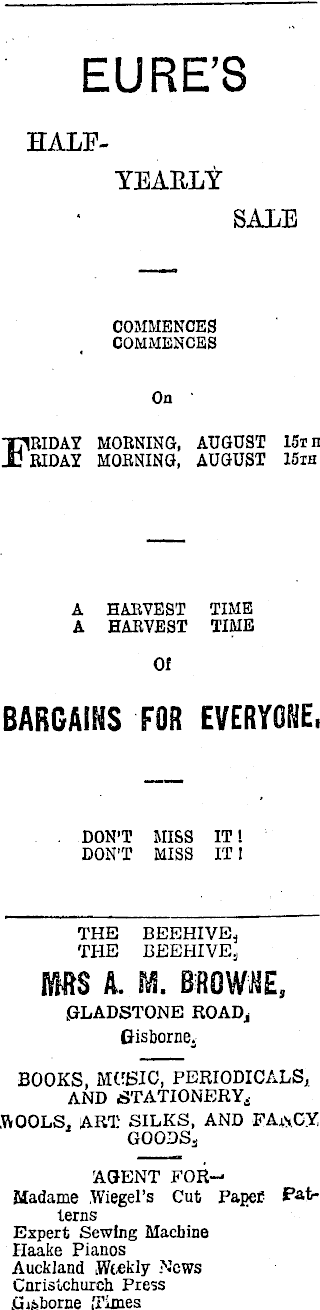 EURE’S HALFYEARLY SALE COMMENCES COMMENCES J? RIDAY MORNING, AUGUST 15m RIDAY MORNING, AUGUST 15ih A HARVEST TIME A HARVEST TIME Of BARGAINS FOR EVERYONE, DON’T MISS IT! DON’T MISS IT! THE BEEHIVE,, THE BEEHIVE S MftS A. M. BROWNE, GLADSTONE ROAD, Gisborne. BOOKS, MUSIC, PERIODICALS, AND STATIONERY. .WOOLS, ART SILKS, AND FAisCY GOODS. AGENT FOR—* Madame Wiegel’s Cut Paper Fatterns Expert Sewing Machine Haake Pianos Auckland Weekly News Cnristchureh Press Gift borne Times