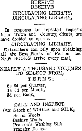 BEEHIVE BEEHIVE CIRCULATING LIBRARY, .CIRCULATING LIBRARY. ! In response to repeated request fr;-.m Town and Country; clients, .we nave decided to open a CIRCULATING LIBRARY, Subscribers can rely upon obtaining all tie Best Works of Fiction and NEW BOOKS arrive every mail. NEARLY A! THOUSAND VOLUMES TO SELECT FROM, TERMS; 6s 6d per Quarter, Is 6d per Month, 6d pec Book, .CALL AND INSPECT, Brr Stock of WOOLS and SILK, Berlin Wools Beehive Wools Pearson’s Washing Silk .Transfer Designs