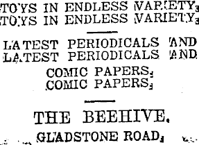 TOTS IN ENDLESS iVAP.r.ETY 3 .TOTS IN ENDLESS iVARIETT a LATEST PERIODICALS 'AND LATEST PERIODICALS AND COMIC PAPERSj .COMIC PAPERS^ THE BEEHIVE. , M .GLADSTONE ROADj v „.