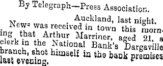 By Telegraph-Press Association. . Auckland, last night. ir,» l Tr r v irl to "' a this Born. II ?° thet Arthur Marnner, a«ed 21 a clerk m the National Bank’s Dargaville Mevenffig. imßd£ tho baok