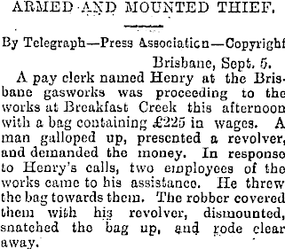 ARMED-AND MOUNTED THIEF. By Telegraph—Press Association—Copyright Brisbane, Sept. 5. A pay clerk named Henry at the Brisbane gasworks was proceeding to the works at Breakfast Creek this afternoon with a bag containing £225 in wages. A man galloped up, presented a revolver, and demanded the money. In responso to Henry’s calls, two employees of the works came to his assistance. He threw the bag towards them. The robber covered them with his revolver, dismounted, snatched tho bag up, end rode clear away.