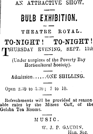 AN ATTRACTIVE SHOW. BULB EXHIBITION. THEATRE ROYAL. TO-NIGHT ! TO-NIGHT ! rjIHUHSDAY EVENING, SEPT. 11th (Under auspices of the Poverty Bay Horticultural Society). Admission ONE SHILLING. Open 'd.:iO to 0.30 ; 7 to 10. Refreshments will be provided at reasonable rates by the Misses Cuff, of the Geisha Tea Rooms. MUSIC. W. J. P. GACDIN, Hon. Sec.