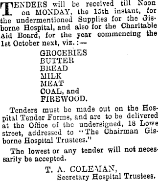 TENDERS will be received till Noon on MONDAY, the loth instant, Jfor the undermentioned Supplies for the. uisborne Hospital, and also for the Charitable Aid Board, for the year commencing the Ist October next, viz. : GROCERIES BUTTER BREAD MILK MEAT COAL, and FIREWOOD. Tenders must bo made out on the Hospital Tender Forms, and are to be delivered at the Office of the undersigned, 18 Lowe street, addressed to “The Chairman Gisborne Hospital Trustees." The lowest or any tender will not necessarily be accepted. T. A. COLEMAN, Secretary Hospital Trustees.