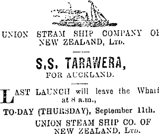 UNION 'A£aSS»**a» STEAM SHIP COMPANY OF NEW ZEALAND, Lid. S.S. TARAWERA, FOR AUCKLAND. LAST LAUNCH will leave the Whaif at .s a.m., TO-DAY (THUHSDAY), September lltli. UNION STEAM SHIP CO. OF NEW ZEALAND, Ltd.