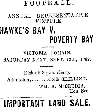 FOOTBALL. ANN UAL REPRESENT ATI \'E FIXTURE, HAWKE'S BAY V. POVERTY BAY. VICTORIA DOMAIN, SATURDAY NEXT, SEPT. 13th, 1902. Kick-olf 3 p.m, sharpAdmission ONE SHILLING. WH. S. McCREDIE, Hon. See. IMPORTANT LAUD SALE.