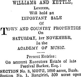 WILLIAMS AND KETTLE, T Limited, Will hold an IMPORTANT SALE Ot OWN AND COUNTRY PROPERTIES, On SATURDAY, Ist NOVEMBER, lu the ACADEMY OF MUSIC. Present Entries: On account Executors Estate of late Percival Barker, Esq.: SECTION No. 3, MOTU, 1090 acres, Bu3h. Section No. 1, Rangiriri, 500 acres open