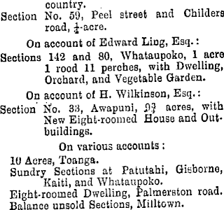 country. Section No. 59, Peel street and Childers road, On account of Edward Ling, Esq.: Sections 142 and 80, Whataupoko, 1 acre 1 rood 11 perches, with Dwelling, Orchard, and Vegetable Garden. On account of H. Wilkinson, Esq.: Section No. 33, Awapuni, 5J aores, with New Eight-roomed House and Outbuildings. On various accounts: 10 Acres, Toanga. Sundry Seotions at Patutahi, Gisborne, Kaiti, and Whataupoko. Eight-roomed Dwelling, Palmerßton road. Balance unsold Sections, Milltown.