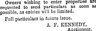 Owners wishing to enter properties are requested to send particulars as soon as possible, as entries will be limited. Full particulars in luiure issue. A. F. KENNEDY, Auctioneer.