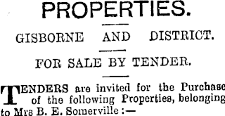 PROPERTIES. GISBORNE AND DISTRICT. FOR SALE BY TENDER, TENDERS are invited for the Purchase of the following Properties, belonging to Mrs B. E. Somerville