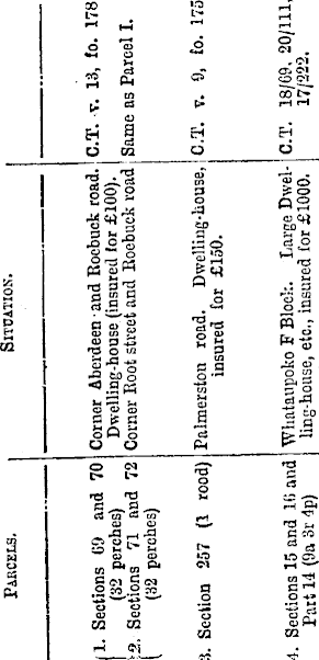 Parcels. Situation. I (1. Sections 09 and 70 j (32 perches) >2, Sections 71 and 72 ( (32 perches) 3. Section 257 (1 rood) 4. Sections 15 and 10 and Part 14 (9a 3r 4p) Corner Aberdeen and Boebuck road. Dwelling-house (insured lor £100). Corner Boot street and Boebuck road Palmerston road. Dwelling-house, insured for £l5O. Whataupoko F Block. Large Dwel-ling-house, etc., insured for £IOOO. C.T. v. 13, 10. 178 Same as Parcel I. C.T. t. 9, to. 175 C.T. 18/09, 20/111, 17/222.