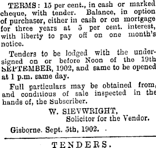 TERMS : 15 per cent., in cash or marked cheque, with tender. Balance, in option of purchaser, either in cash or on mortgage for three years at 5 por cent, interest, with liberty to pay off on one month’s notice. Tenders to be lodged with the undersigned on or before Noon of the 19th SEPTEMBER, 1902, and same to be opened at 1 p.m. same day. Full particulars may be obtained . from, and conditious of sale inspected in the hands of, the bubseriber. W. SIEVWRIGHT, Solicitor for the Vendor. Gisborne. Sept, otb, 1902. ■ TENDERS.