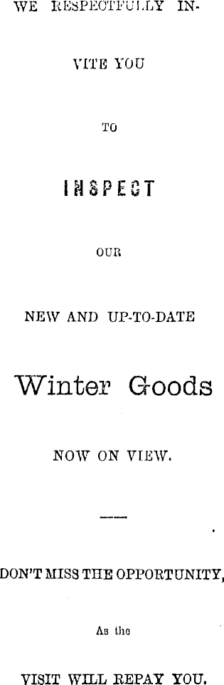 WE RESPECTFULLY INVITE YOU TO INBPEQT OUR NEW AND UP-TO-DATE Winter G-oods NOW ON VIEW. DON’T MISS THE OPPORTUNITY, Aa tha VISIT WILL REPAY YOU.