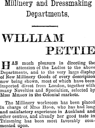 Millinery and Dressmaking Departments. WILLIAM FETTIE HAS much pleasure in directing the attention of the Ladies to the above Departments, and to the very large display of New Millinery Goods of every description now being shown, most of which have been imported direot from London, together with many Novelties and Specialties, selected by Miss Milsoh in the Colonial markets. Tho Millinery workroom has been placed in charge of Miss Hooo, who has had long and satisfactory experience in Auckland and other centres, and already her good ta6te in Trimming has been most favorably commented upon.
